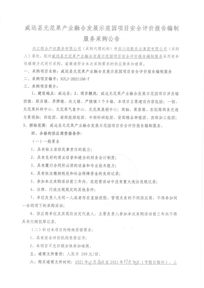 威远县无花果产业融合发展示范园项目安全评价报告编制服务采购公告