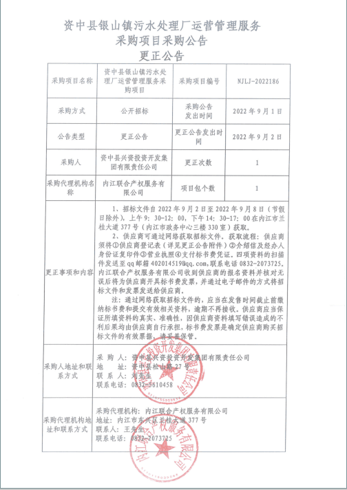 资中县银山镇污水处理厂运营管理服务采购项目采购公告更正公告
