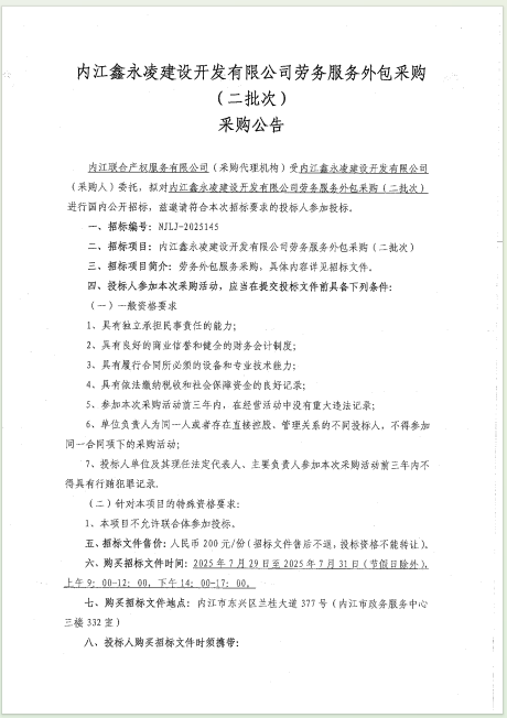 内江鑫永凌建设开发有限公司劳务服务外包采购(二批次)采购公告