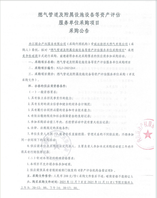 燃气管道及附属设施设备等资产评估服务单位采购项目采购公告