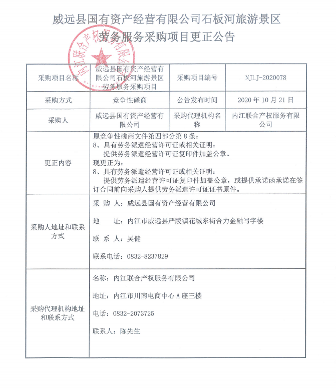 威远县国有资产经营有限公司石板河旅游景区劳务服务采购项目更正公告