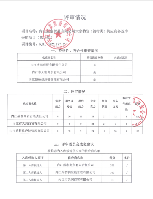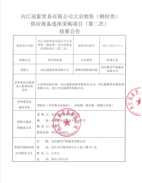 内江冠泰贸易有限公司大宗物资(钢材类)供应商备选库采购项目(第二次)结果公告