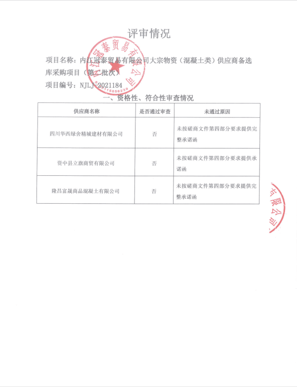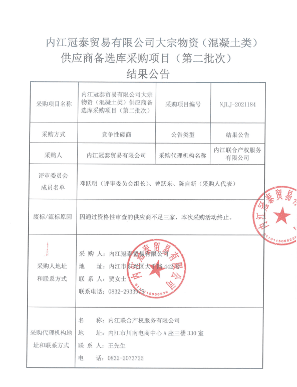 内江冠泰贸易有限公司大宗物资(混凝土类)供应商备选库采购项目(第二批次)结果公告