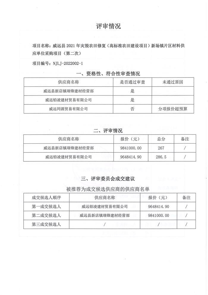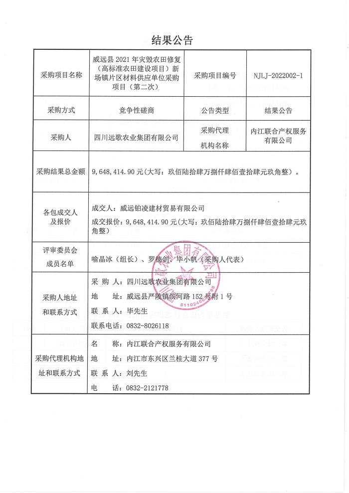 威远县2021年灾毁农田修复(高标准农田建设项目)新场镇片区材料供应单位采购项目(第二次)结果公告