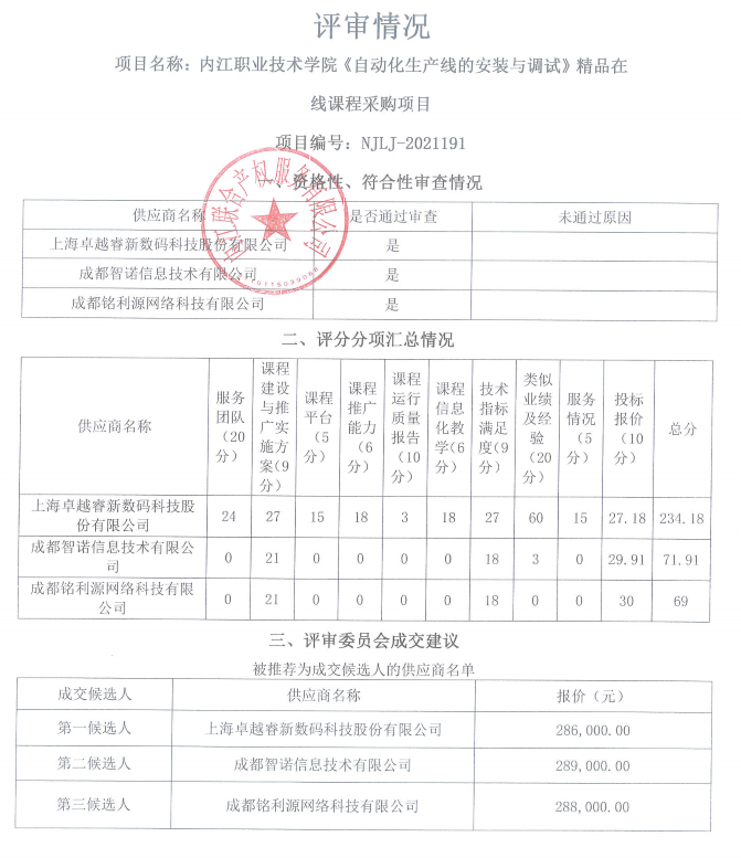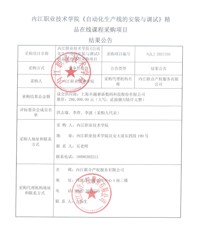 内江职业技术学院《自动化生产线的安装与调试》精品在线课程采购项目结果公告