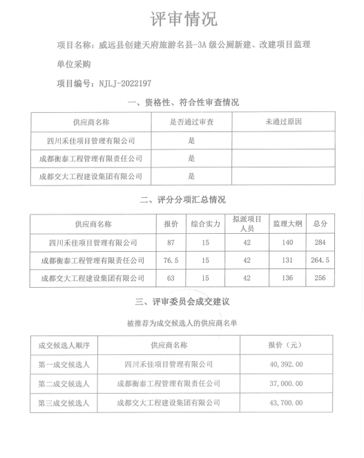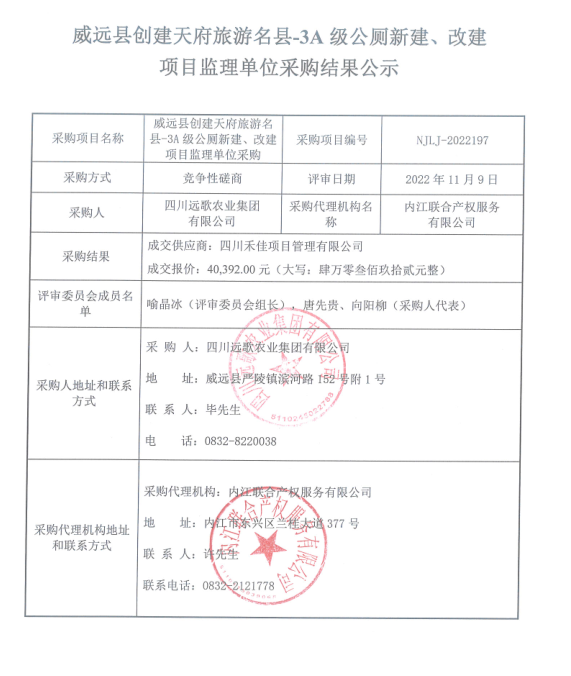 威远县创建天府旅游名县-3A级公厕新建、改建项目监理单位采购结果公示