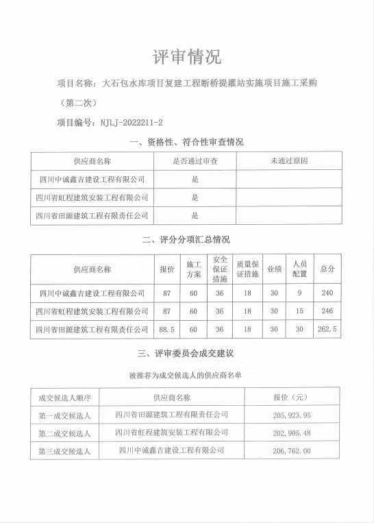 大石包水库项目复建工程断桥提灌站实施项目施工采购(第二次)结果公示