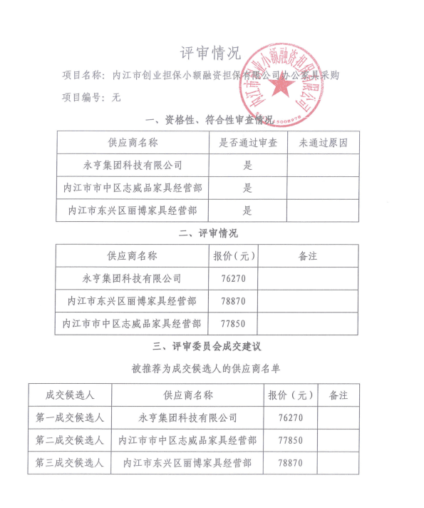 内江市创业小额融资担保有限公司办公家具采购结果公告