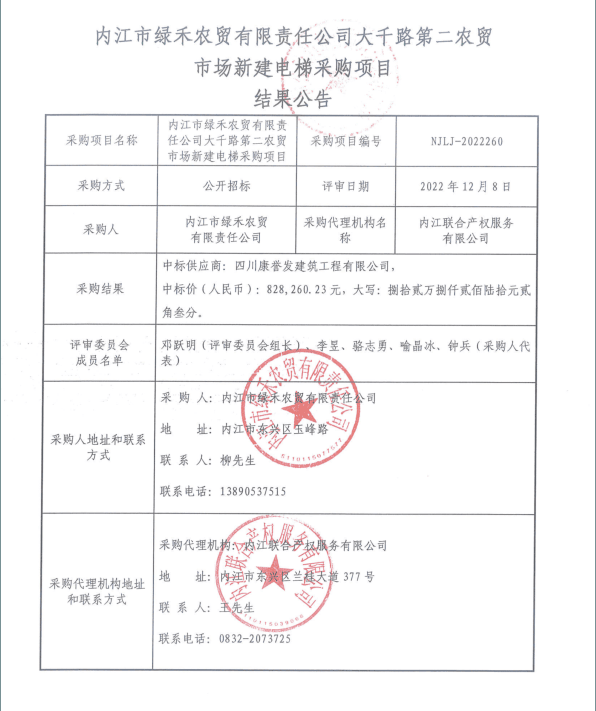 内江市绿禾农贸有限责任公司大千路第二农贸市场新建电梯采购项目结果公告
