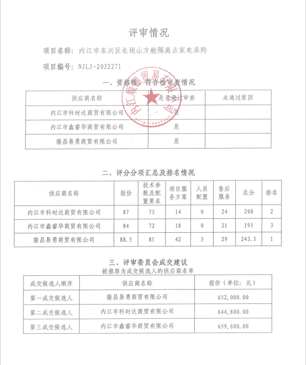 内江市东兴区长坝山方舱隔离点家电采购结果公告