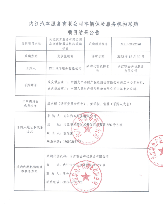 内江汽车服务有限公司车辆保险服务机构采购项目结果公告