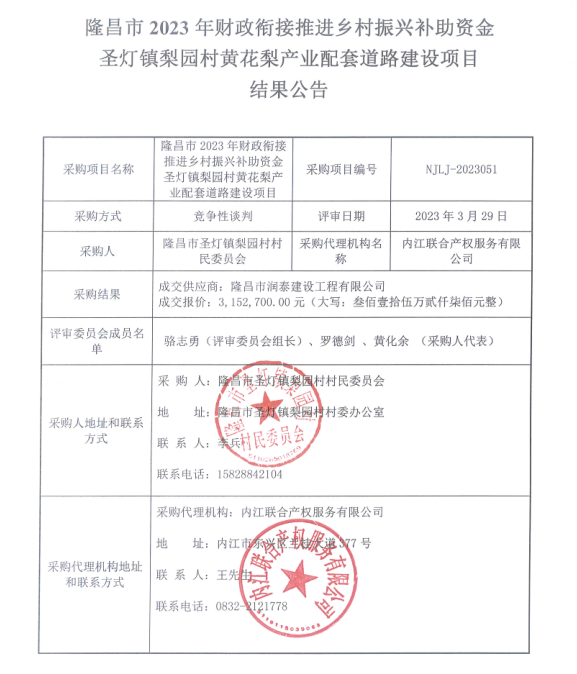 隆昌市2023年财政衔接推进乡村振兴补助资金圣灯镇梨园村黄花梨产业配套道路建设项目结果公告