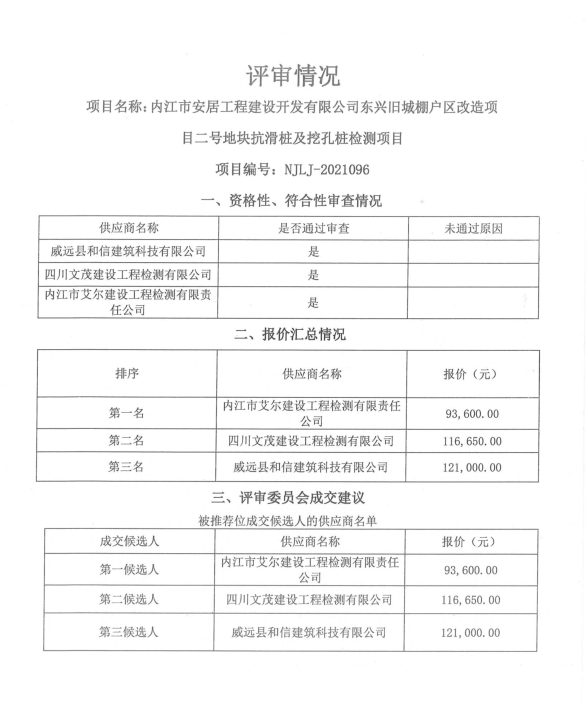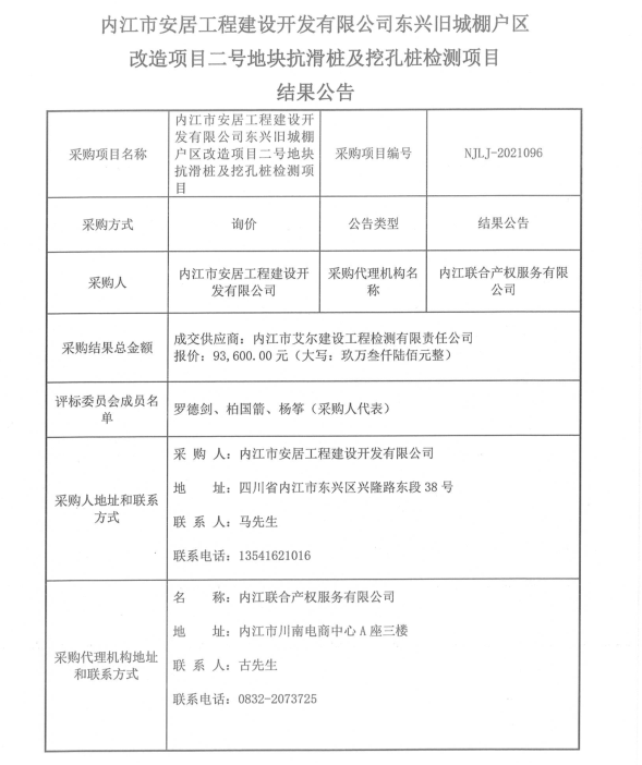 内江市安居工程建设开发有限公司东兴旧城棚户区改造项目二号地块抗滑桩及挖孔桩检测项目结果公告
