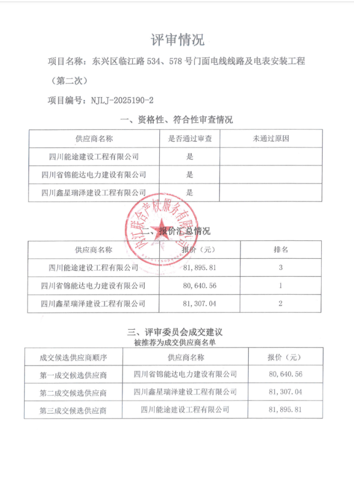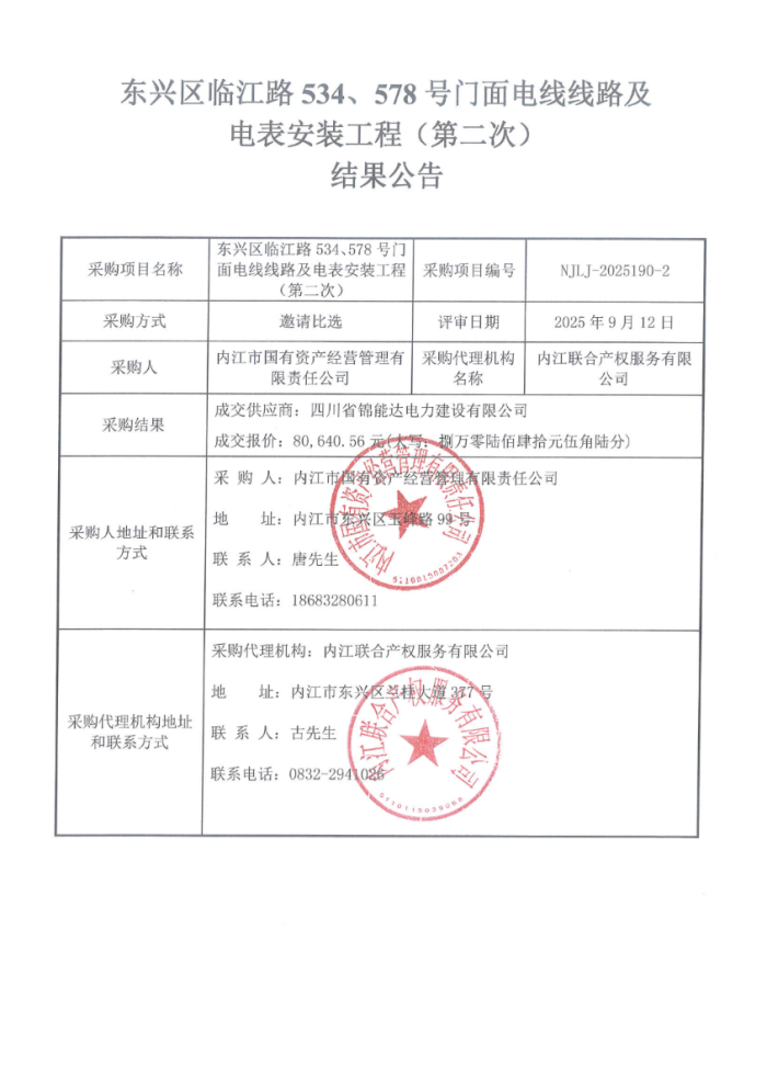 东兴区临江路534、578号门面电线线路及电表安装工程(第二次)结果公告