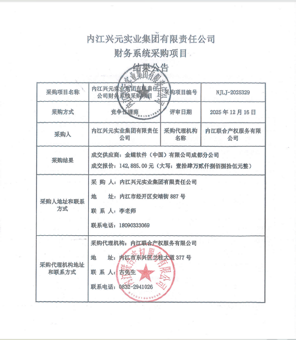 内江兴元实业集团有限责任公司财务系统采购项目结果公告