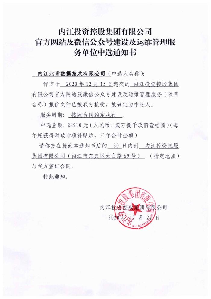 内江投资控股集团有限公司官方网站及微信公众号建设及运维管理服务单位结果公告