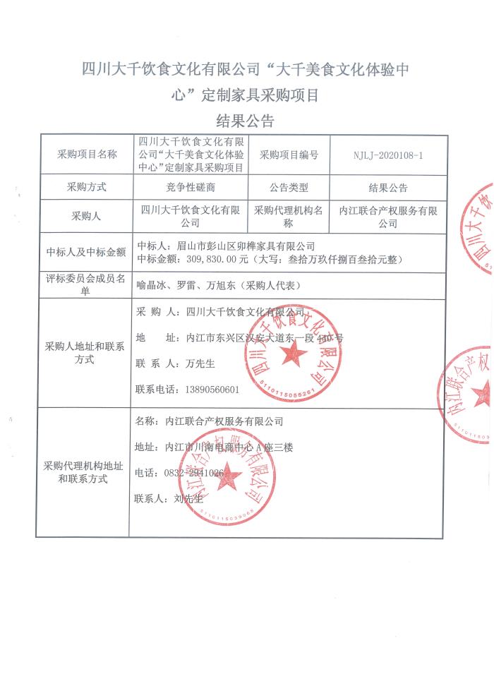 四川大千饮食文化有限公司“大千美食文化体验中心”定制家具采购项目结果公告
