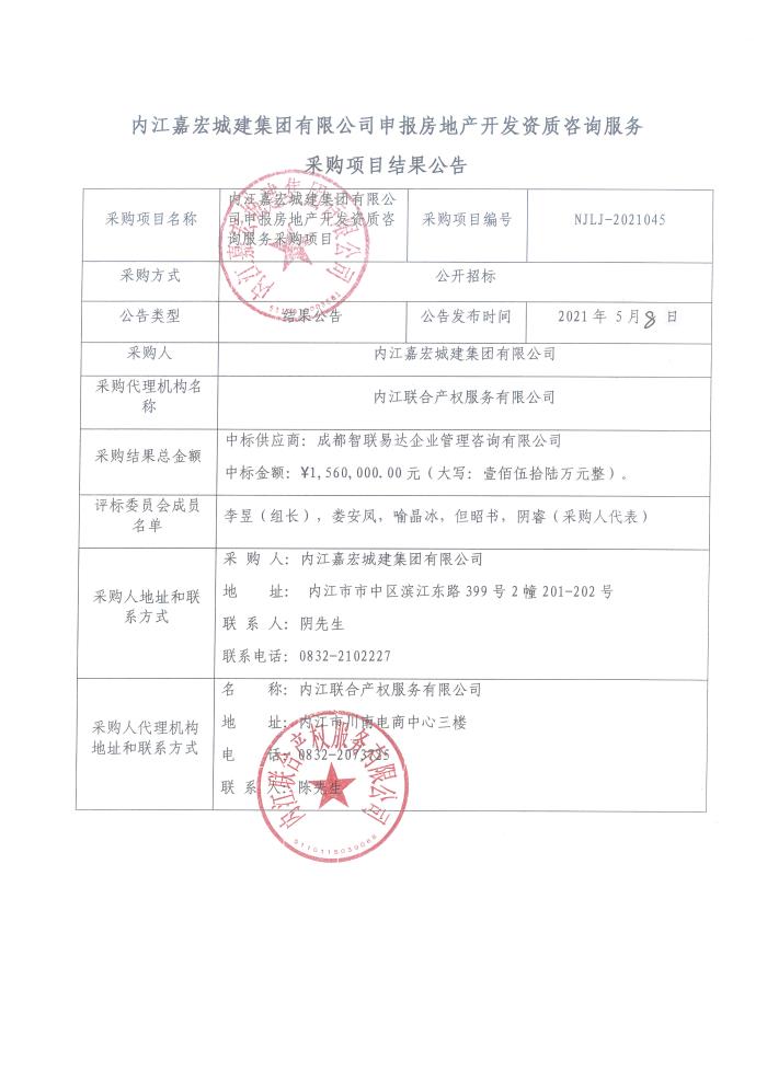 内江嘉宏城建集团有限公司申报房地产开发资质咨询服务采购项目结果公告