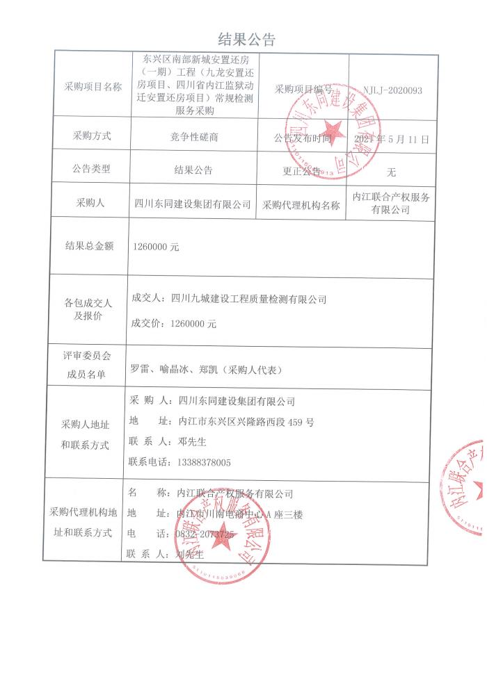 东兴区南部新城安置还房(一期)工程(九龙安置还房项目、四川省内江监狱动迁安置还房项目)常规检测服务采购竞争性磋商结果公告