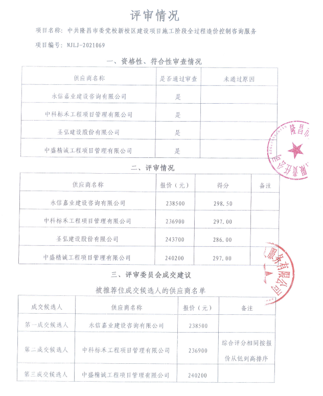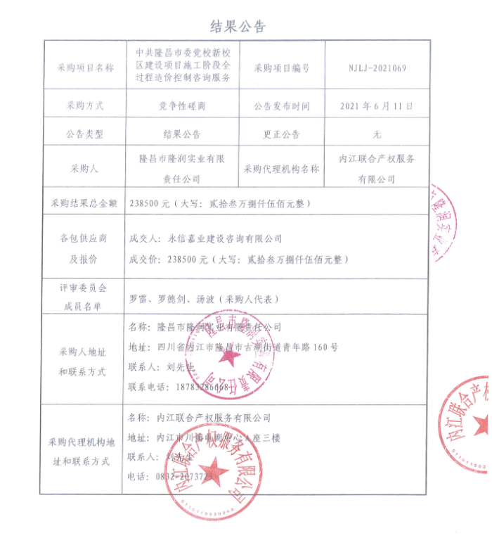 中共隆昌市委党校新校区建设项目施工阶段全过程造价控制咨询服务结果公告