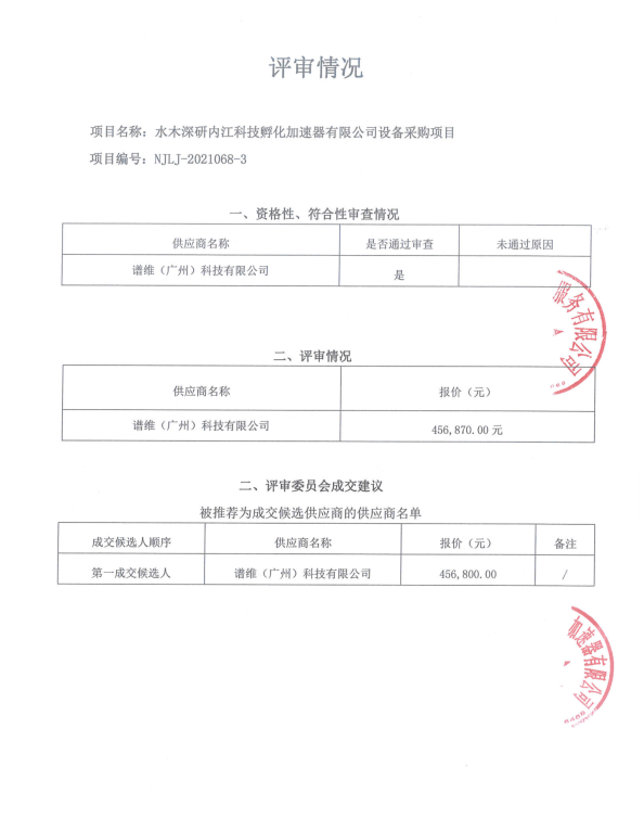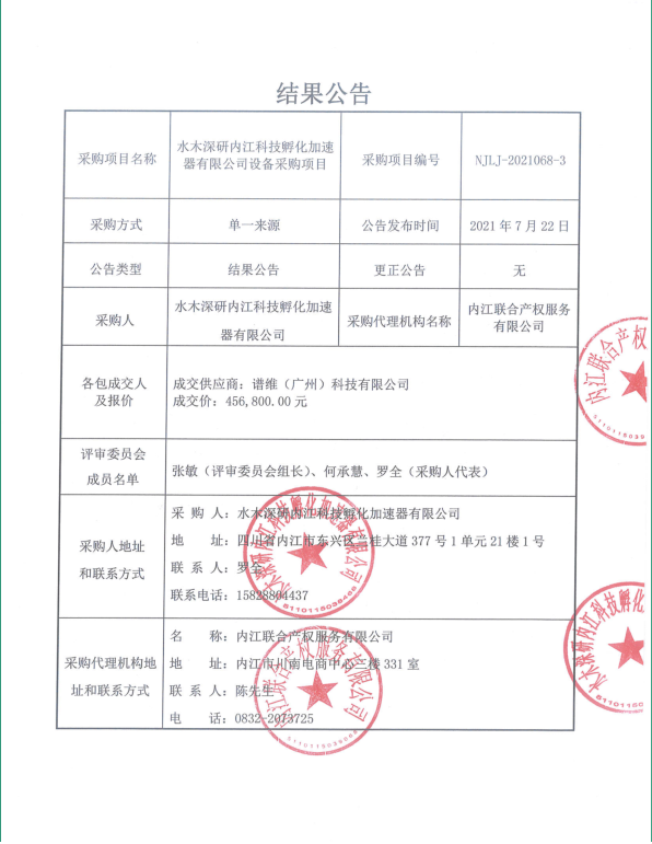 水木深研内江科技孵化加速器有限公司设备采购项目结果公告