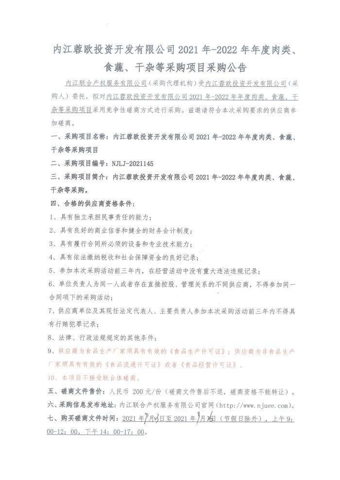 内江蓉欧投资开发有限公司2021年-2022年年度肉类、食蔬、干杂等采购项目采购公告
