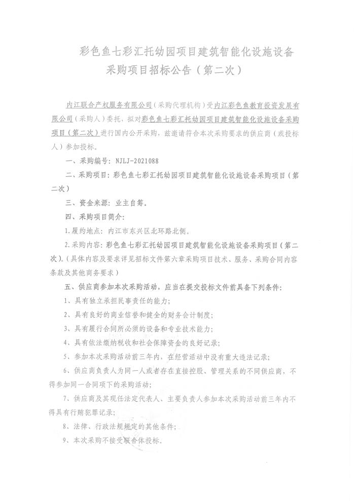 彩色鱼七彩汇托幼园项目建筑智能化设施设备采购项目采购公告(第二次)