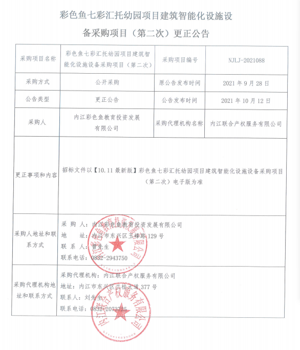 彩色鱼七彩汇托幼园项目建筑智能化设施设备采购项目(第二次)更正公告