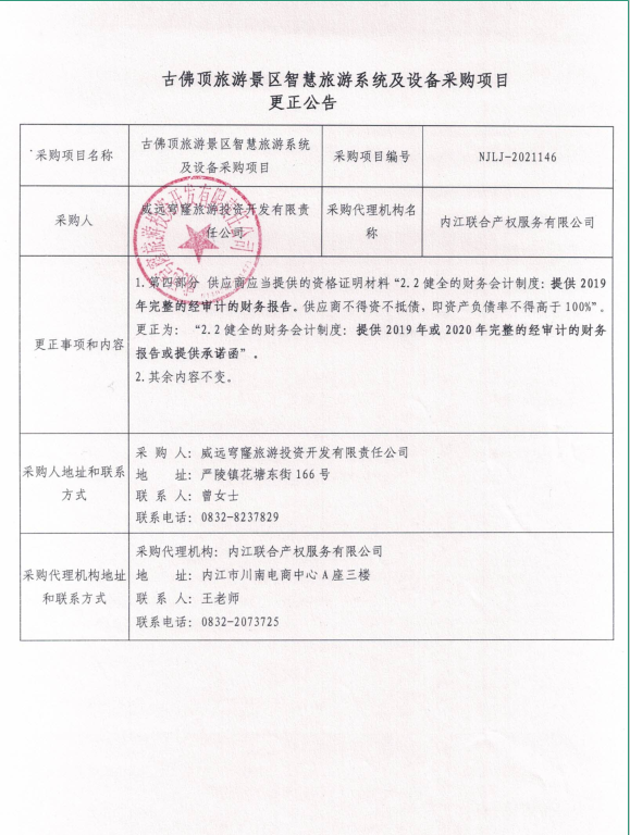 古佛顶旅游景区智慧旅游系统及设备采购项目更正公告