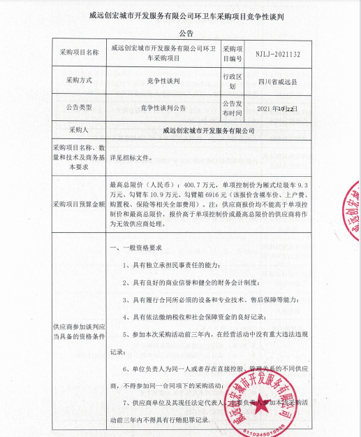 威远创宏城市开发服务有限公司环卫车采购项目采购公告