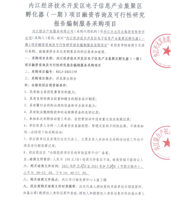 内江经济技术开发区电子信息产业集聚区孵化器(一期)项目融资咨询及可行性研究报告编制服务采购项目采购公告