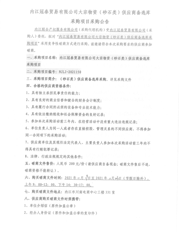 内江冠泰贸易有限公司大宗物资(砂石类)供应商备选库采购项目采购公告