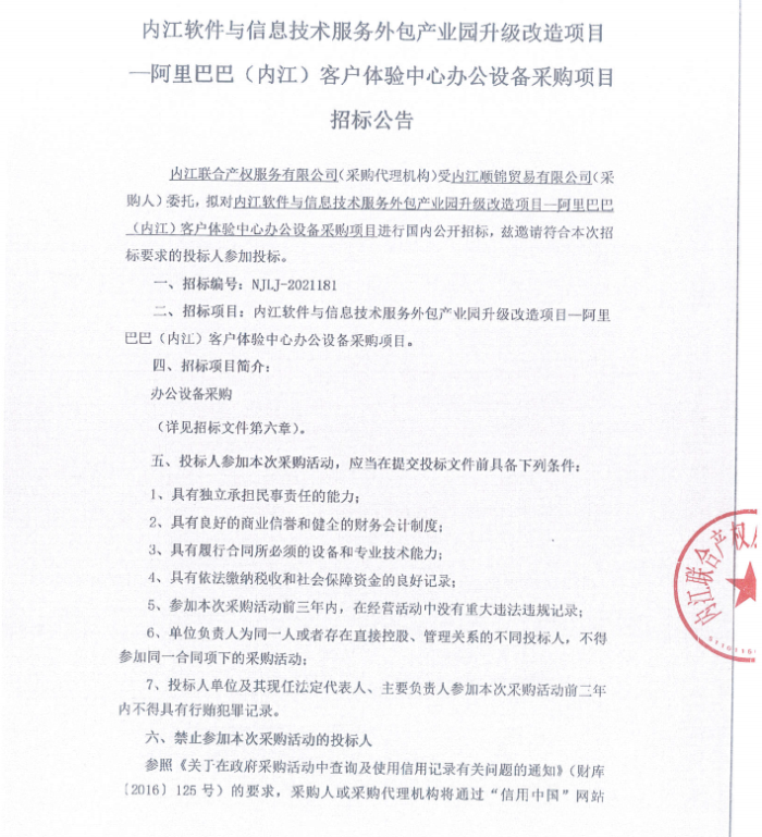 内江软件与信息技术服务外包产业园升级改造项目—阿里巴巴(内江)客户体验中心办公设备采购项目采购公告