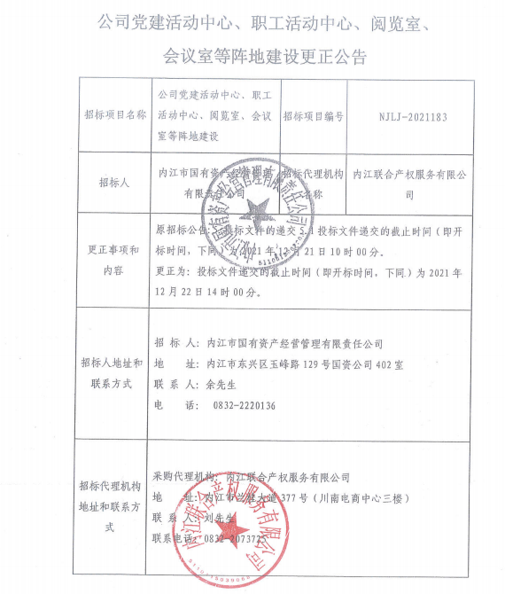公司党建活动中心、职工活动中心、阅览室、会议室等阵地建设更正公告