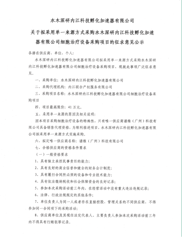 关于拟采用单一来源方式采购水木深研内江科技孵化加速器有限公司细胞治疗设备采购项目的征求意见公示