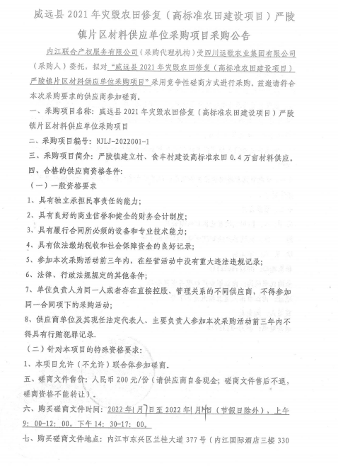 威远县2021年灾毁农田修复(高标准农田建设项目)严陵镇片区材料供应单位采购项目公告