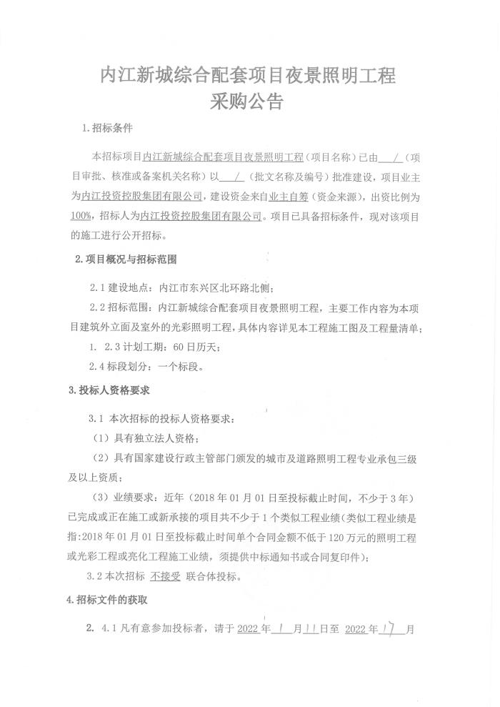 内江新城综合配套项目夜景照明工程招标公告