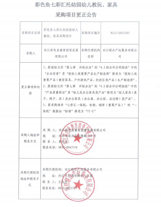 彩色鱼七彩汇托幼园幼儿教玩、家具 采购项目更正公告