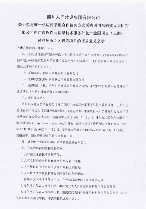 四川东同建设集团有限公司关于拟与唯一供应商采用合作谈判方式采购四川东同建设集团有限公司内江市软件与信息技术服务外包产业园项目(三期)过渡场所D区租赁项目的征求意见公示