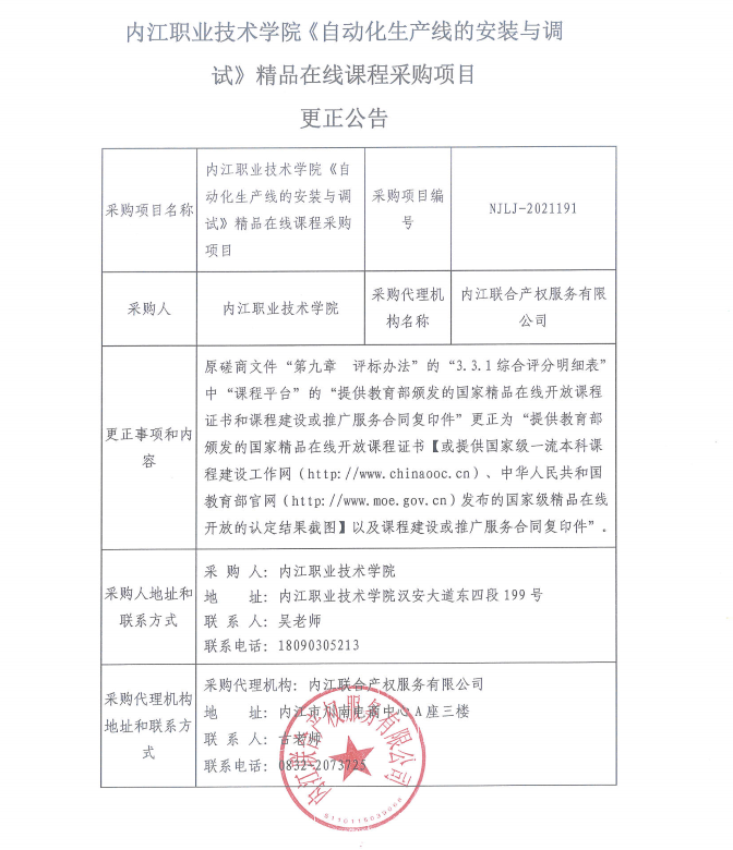 内江职业技术学院《自动化生产线的安装与调试》精品在线课程采购项目更正公告