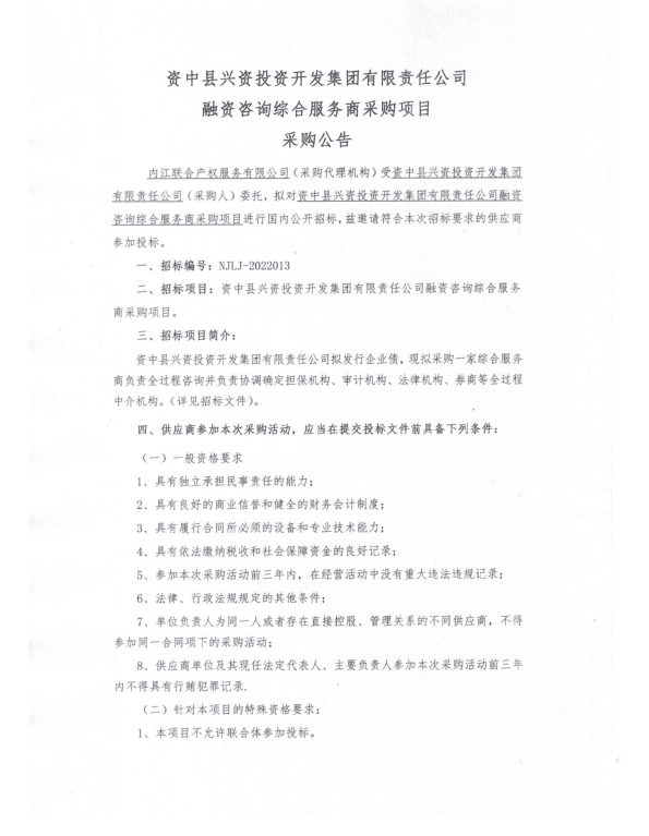 资中县兴资投资开发集团有限责任公司融资咨询综合服务商采购项目采购公告