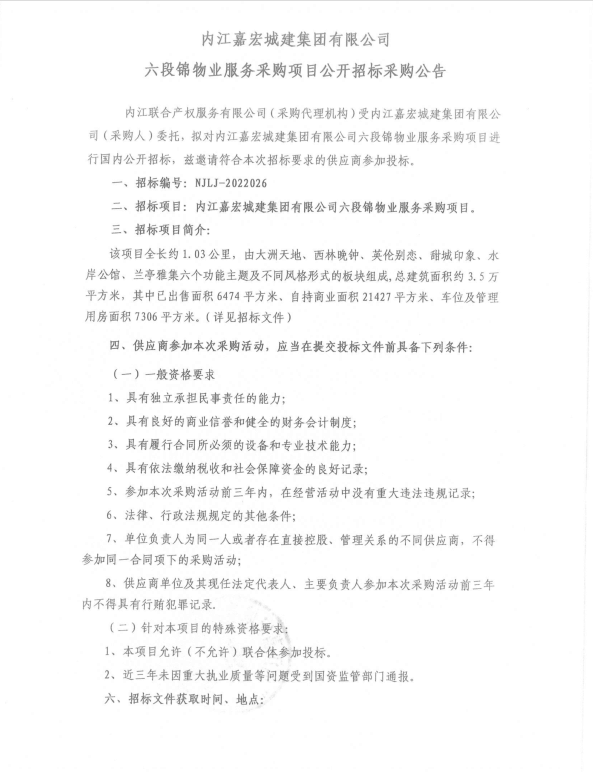 内江嘉宏城建集团有限公司六段锦物业服务采购项目采购公告