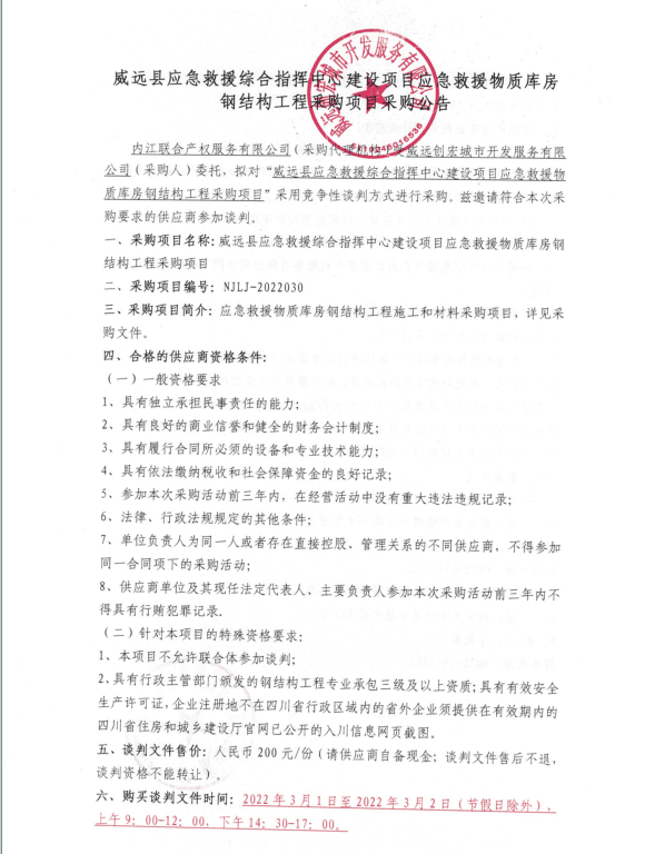 威远县应急救援综合指挥中心建设项目应急救援物质库房钢结构工程采购项目采购公告