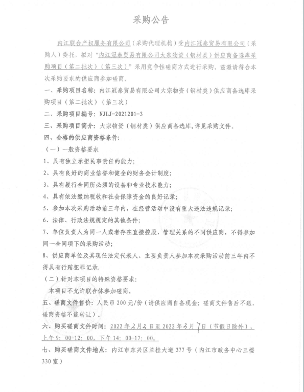 内江冠泰贸易有限公司大宗物资(钢材类)供应商备选库采购项目(第二批次)(第三次)采购公告