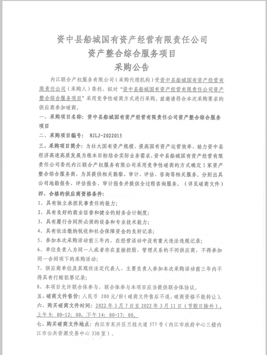 资中县船城国有资产经营有限责任公司资产整合综合服务项目采购公告