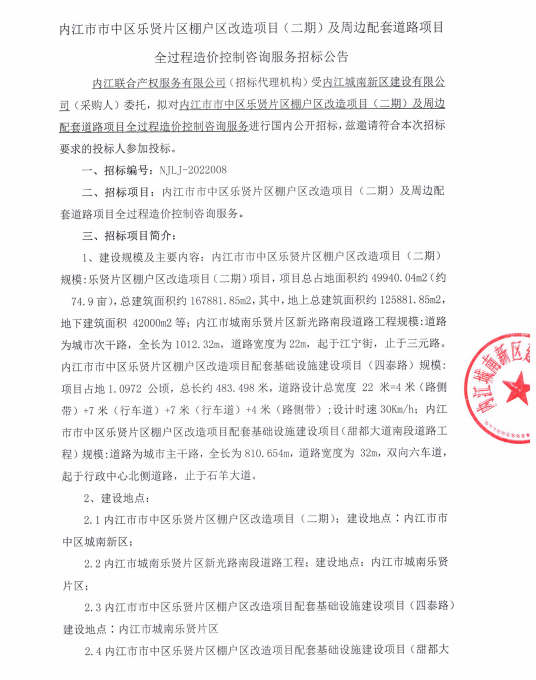 内江市市中区乐贤片区棚户区改造项目(二期)及周边配套道路项目全过程造价控制 咨询服务招标公告