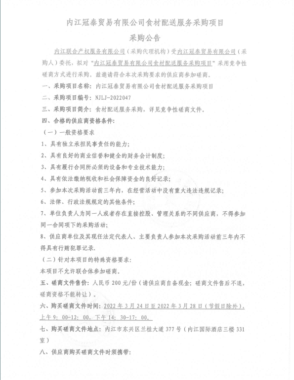 内江冠泰贸易有限公司食材配送服务采购项目采购公告