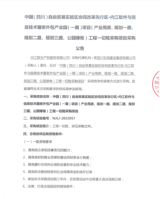 中国(四川)自由贸易实验区协同改革先行区·内江软件与信息技术服务外包产业园(一期)项目(产业用房、规划一路、规划二路、规划三路、公园绿地)工程一切险采购项目