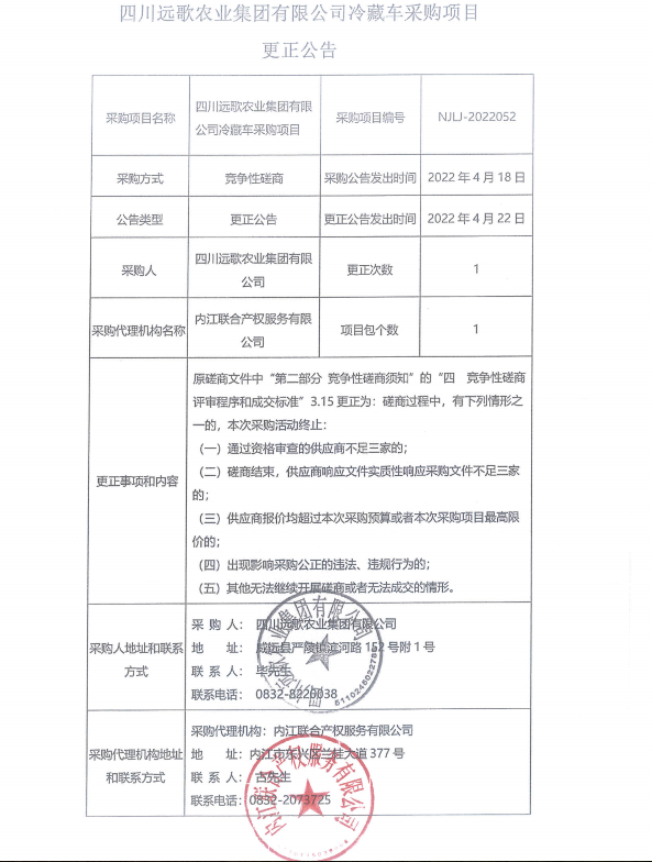 四川远歌农业集团有限公司冷藏车采购项目更正公告