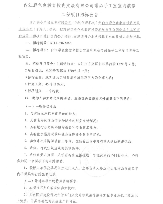 内江彩色鱼教育投资发展有限公司甜品手工室室内装修工程项目招标公告